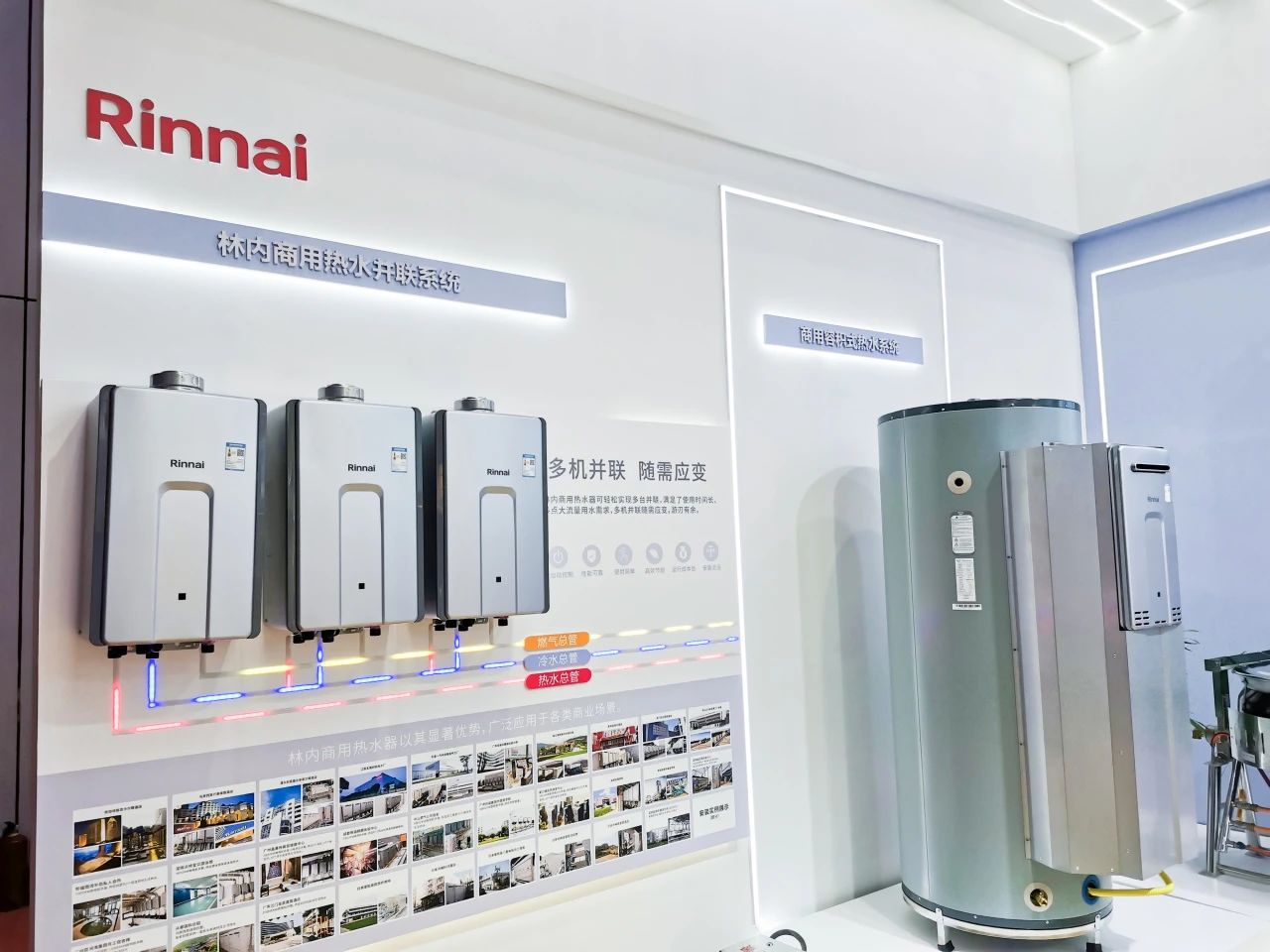 林内的落地式热水系统、壁挂式热水系统和容积式热水系统3大商用热水系统,在本届展会悉数亮相。林内商用热水系统具有性能可靠、使用简单、运行成本低、安全灵活、全自动控制等特点,支持多机并联,可24小时提供稳定高效热水。林内商用型热水器能适应各种商用场合的用水,解决了商家担心的各种热水问题,让用水从容有度,更加舒适。