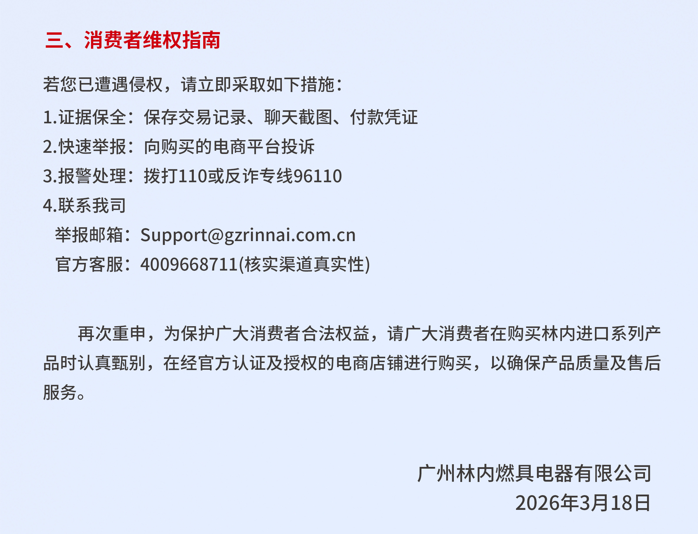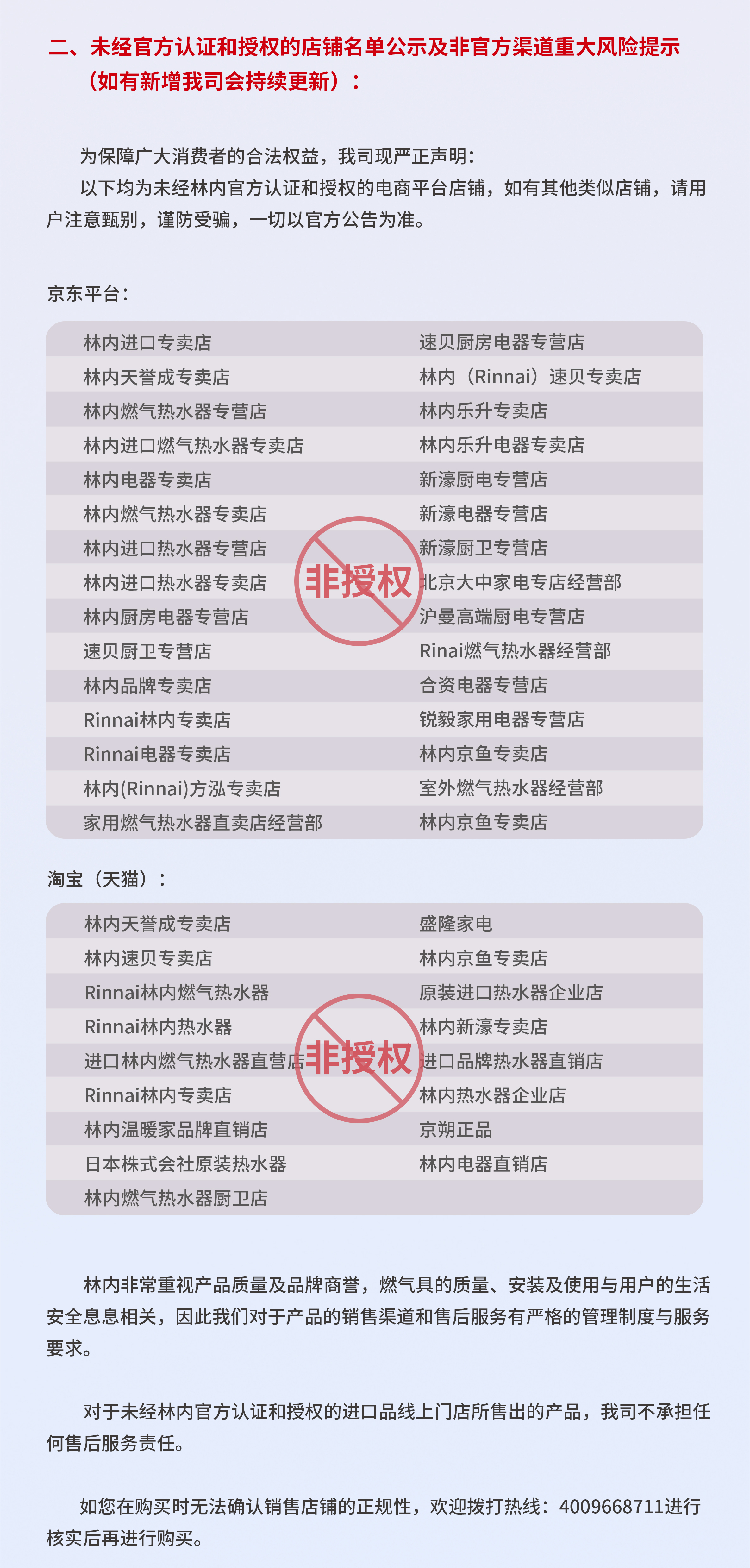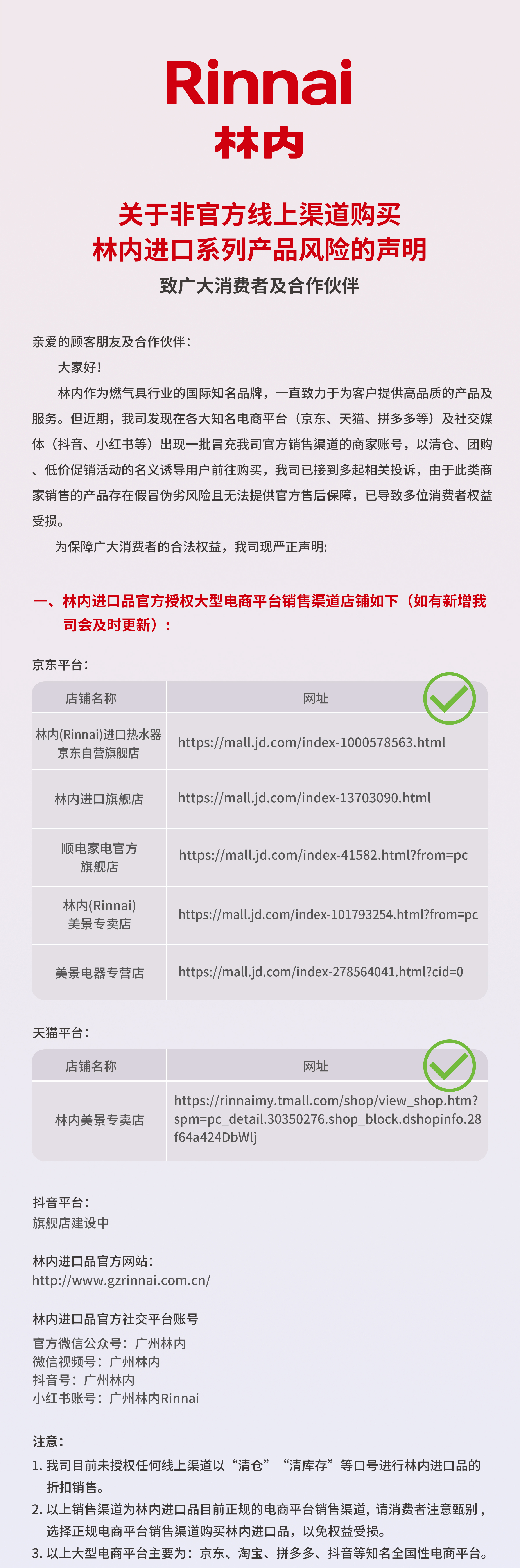 关于非官方线上渠道购买林内进口系列产品风险的声明(数据截至2026年3月)